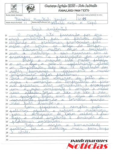 através de aluno e professor no mesmo projeto. A redação premiada, destacou com autoridade o tema sobre meio ambiente.