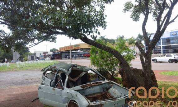 a empresa Mecautor, localizada na Avenida Ipiranga se mostram preocupados com um veículo Brasília acidentado, e que serviu para uma campanha de prevenção de