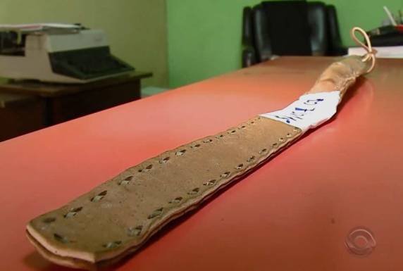 à polícia fotos das marcas dos golpes de relho e passou por exame de corpo de delito. O objeto foi apreendido.
