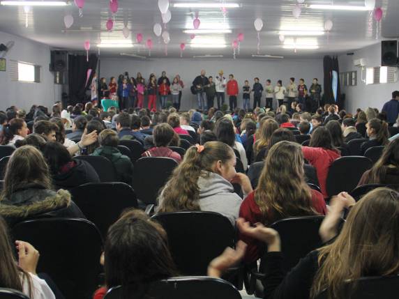 uma apresentação artística para alunos da rede municipal de ensino de Três de Maio. A atividade ocorreu no Auditório da Escola Germano Dockhorn e contou