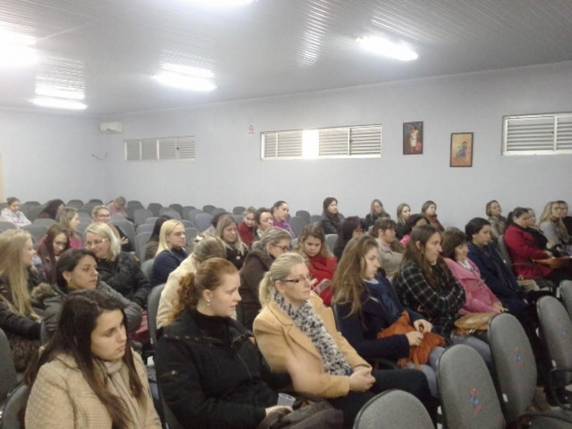 as Equipes Diretivas, Professores, Auxiliares de Educação Infantil, Monitores e Atendentes de Creche junto ao auditório da Escola Municipal de Ensino Fundamental (EMEF)