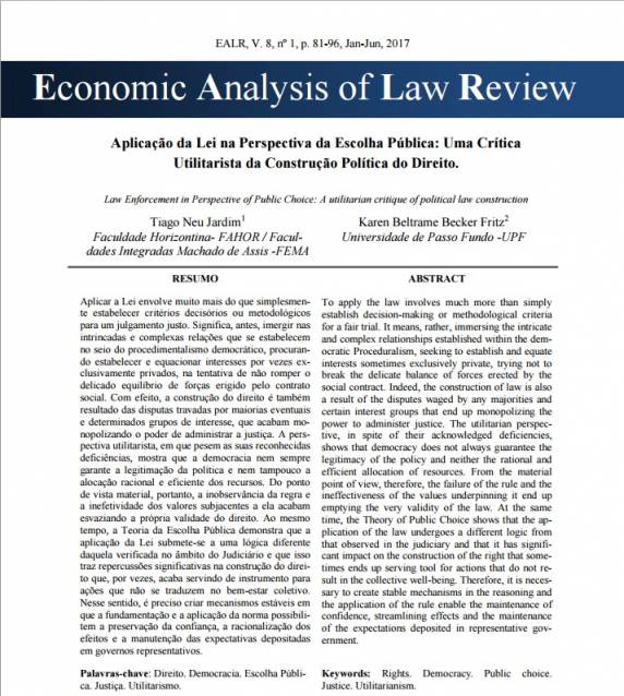 na quinta-feira, 2 de agosto, na prestigiada revista “Economic Analysis of Law Review”, da UCB - Universidade Católica de Brasília. A proposta foi