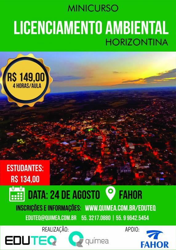Horizontina é parceiro do minicurso sobre Licenciamento Ambiental, que será promovido pela Químea Soluções Ambientais, no dia 24 de agosto, no Campus