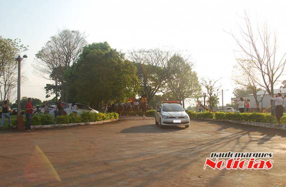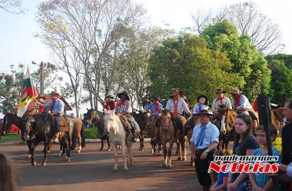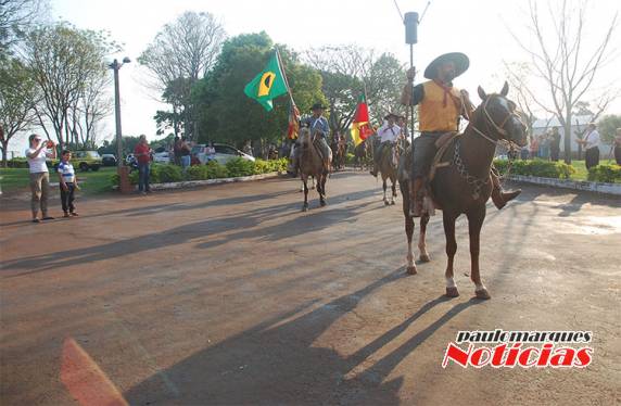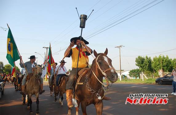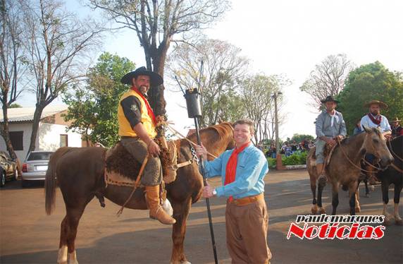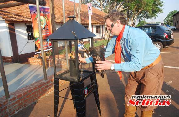 Coordenou mais uma vez a cavalgada do Tropeiros do Buricá, o tradicionalista Flávio Huber, que entregou a centelha ao patrão Gilmar Fischer, que por sua vez acendeu-a na pira Paulo Silva.