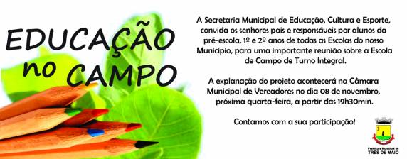 alunos da pré-escola, 1º e 2º anos de todas as Escolas do nosso Município, para uma importante reunião sobre a Escola de Campo de Turno Integral, onde os