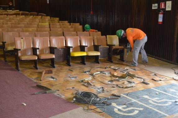 reforma ocorrerá a substituição do parquê do piso inferior do teatro/auditório por piso vinílico e a troca de todas as poltronas da parte inferior.