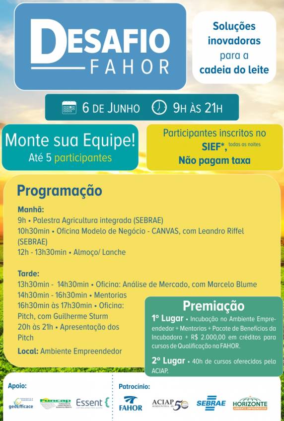 O DESAFIO FAHOR acontece dia 6 de junho, a partir das 9 horas da manhã às 21 horas tendo por local o Ambiente Empreendedor com o tema: “Soluções inovadoras para a cadeia produtiva do Leite”, com apoio do APL Leite, Sebrae, Horizonte Ambiente Empreendedor, por meio das empresas incubadas e ACIAP de Horizontina. A programação inicia com a palestra “Agricultura Integrada”, seguida pela oficina “Modelo de Negócio”, sendo que durante a tarde, será realizada uma Oficina de Análise de Mercado, Oficina de Pitch e então, serão iniciadas as mentorias e desenvolvimento das ideias.