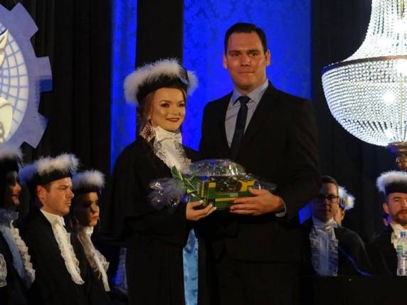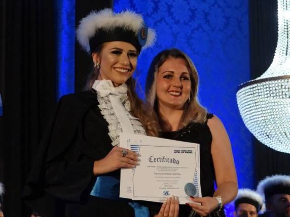 A SAE Brasil – Seção Caxias do Sul entregou à formanda de Engenharia de Produção, Patrícia Taís Pohl, uma lembrança por sua participação no projeto Baja SAE Brasil e por sua atuação na área de Engenharia da Mobilidade. O certificado foi entregue pela representante da FAHOR na SAE Brasil - Seção Caxias do Sul, professora Francine Centenaro Gomes.