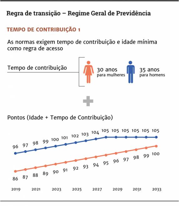 A primeira alternativa leva em consideração o tempo de contribuição e a idade. A fórmula é parecida com a regra atual para requerer a aposentadoria integral, pela regra 86/96 — que prevê soma de 86 anos dos dois fatores para mulheres e 96 para homens, respeitando o mínimo de 35 anos de contribuições para trabalhadores do sexo masculino e 30 para o feminino. Esta possibilidade de transição prevê acréscimo de um ponto percentual por ano, até chegar, em 2028, a 105 pontos para homens e, em 2033, a 100 pontos.
