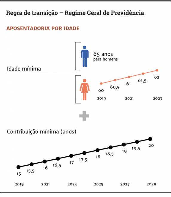 A segunda possibilidade observa tempo de contribuição e idade mínima. Pela proposta do governo federal, homens só poderão se aposentar com 65 anos e, mulheres, com 62 anos, após este período de transição. Para os homens, esta janela de tempo vai durar oito anos, começando com idade de 61 anos. Para as mulheres, o período de transição é de 12 anos, começando com a idade de 56 anos.
