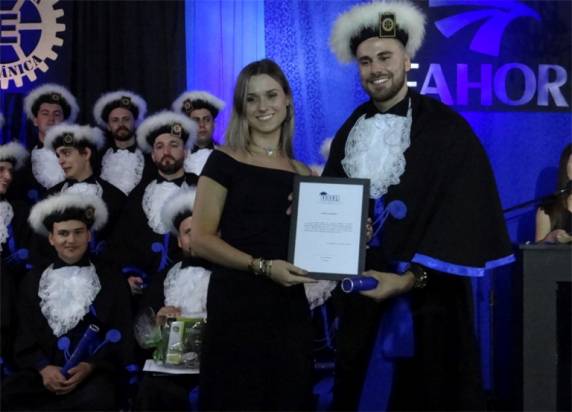O DAFH - Diretório Acadêmico FAHOR também homenageou o estudante de Engenharia Mecânica que teve maior atividade junto ao DAFH. A Presidente do Diretório Acadêmico, Bruna Laís Rüchel realizou a entrega de um certificado em homenagem ao formando Alvaro Balestrin.