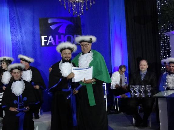 Entre os muitos momentos emocionantes, estiveram as premiações aos acadêmicos que tiveram excelente desempenho durante a graduação. Para o estudante que obteve a melhor média no transcorrer do curso, incluindo o Trabalho de Conclusão de Curso e Estágio, o Diretor da FAHOR, professor Sedelmo Desbessel, realizou a entrega de uma Láurea Acadêmica e uma bolsa de estudos na FAHOR, para Curso de Pós-graduação. O Engenheiro Mecânico, Valcir Marques de Menezes recebeu a Láurea.