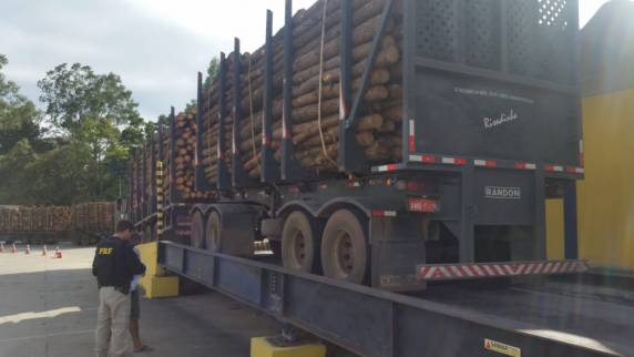 Policiais rodoviários federais flagraram hoje de manhã, na BR 116, em Mafra, dois caminhões do Paraná transportando toras de madeira, vindo de Santa Cecília/SC com destino à cidade de Araucária/PR.