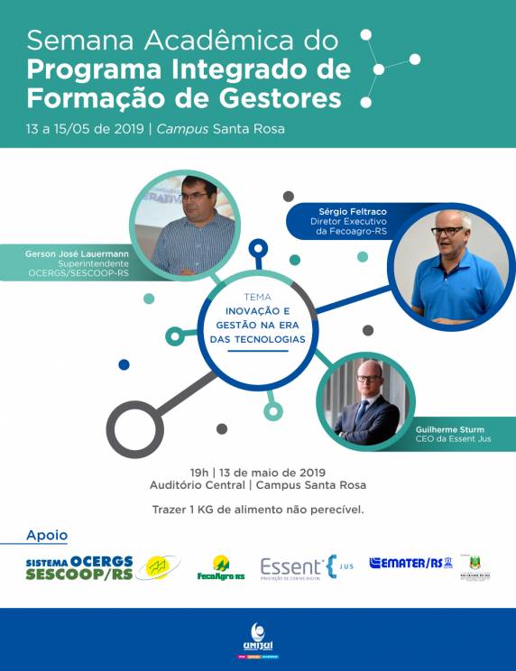 A primeira noite da Semana Acadêmica da Unijuí de Santa Rosa vai destacar a força do cooperativismo regional. O evento que acontece no auditório central da instituição, na segunda-feira, 13, contará com a presença do Superintendente da OCERGS/SESCOOP Gerson José Lauermann, do Diretor Executivo da Fecoagro Sérgio Feltraco e Guilherme Sturm CEO da Essent Jus, que falarão sobre “A Inovação e Gestão na Era das Tecnologias”. O painel que inicia as 19 horas terá a mediação do Professor Pedro Büttenbender.