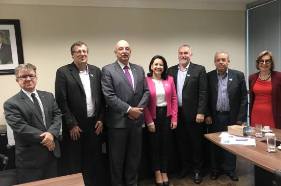 Vanderli de Barros, Diretora Geral do Hospital Vida & Saúde, Luis Antônio Benvegnu, Vice-prefeito de Santa Rosa, vereador Osório Antunes, presidente da Comissão de Saúde e Délcio Steffan, presidente da FUMSSAR estiveram em Brasília nesta semana. A comitiva esteve reunida com o Ministro Osmar Terra e Claudio Franke para tratar de demandas do município.