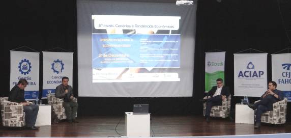 O tema da 8ª edição do Painel tratou das “Perspectivas para a Economia em 2020”, e foi apresentado pelos professores Tiago Neu Jardim, economista e advogado, Márcio Kalkmann, economista e Stephan Sawitzki, economista e coordenador dos Cursos de Ciências Econômicas e Gestão Financeira da FAHOR. O Painel teve a participação do administrador, especialista em marketing e vice-diretor da FAHOR, Marcelo Blume como mediador.