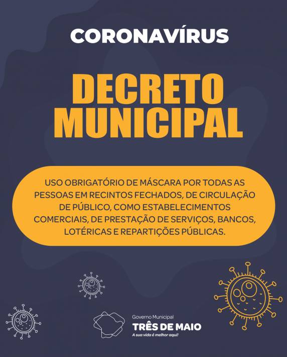 Art. 1o Fica reiterado o estado de calamidade pública em todo o território do Município de Três de Maio para fins de prevenção e de enfrentamento à pandemia causada pelo COVID-19 (novo Coronavírus), consoante disposições do Decreto nº 21/2020. ![]()