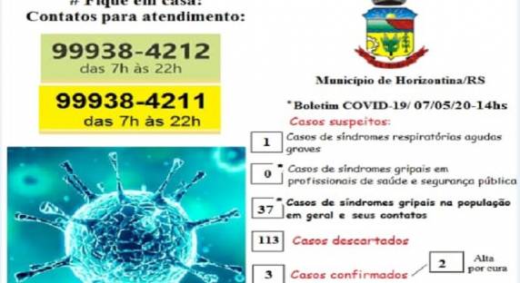 No 50º primeiro dia de mobilização e enfrentamento ao Corona Vírus no município de Horizontina foi confirmado hoje (07) o 3º caso de contaminação. Trata-se de uma paciente do sexo feminino, 43 anos, que teve contato com pessoa que testou positivo de sua relação familiar em município vizinho.