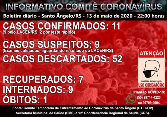O Informativo oficial do Comitê Temporário de Enfrentamento ao Coronavírus, Secretaria Municipal de Saúde e da 12ª Coordenadoria Regional de Saúde (em anexo), apresenta os dados relativos ao dia 13 de maio, atualizado às 22 horas.