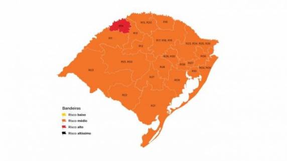 O mapa preliminar da 26ª rodada do modelo de Distanciamento Controlado, divulgado nesta sexta-feira (30/10), se mantém com apenas uma região em bandeira vermelha – novamente na macrorregião Missioneira. Desta vez, a região Covid classificada como alto risco epidemiológico é a de Santa Rosa. Em vermelho na 25ª rodada, Cruz Alta voltou para a bandeira laranja (risco epidemiológico médio). As demais 19 regiões do mapa permanecem em bandeira laranja.
