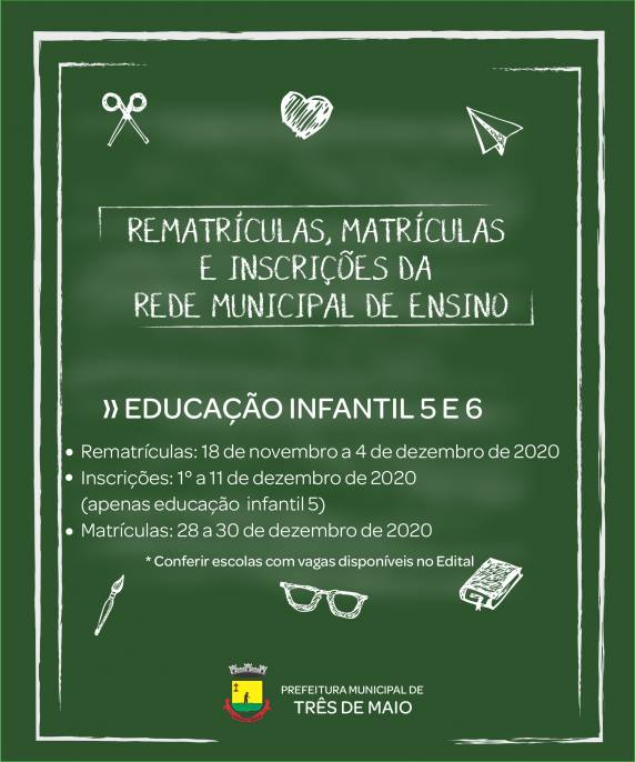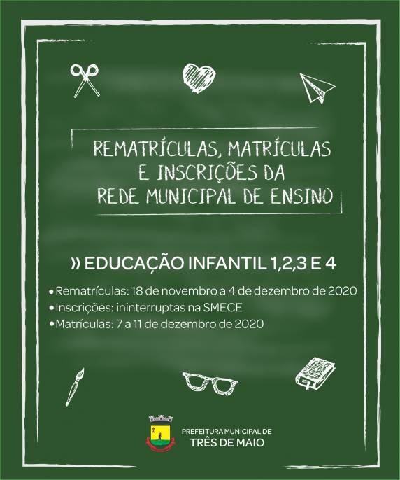 O Presidente da Câmara Municipal de Vereadores no exercício do cargo de Prefeito Municipal de Três de Maio – RS, Ivo Novotny, no uso de suas atribuições, torna público, em cumprimento ao que dispõe a Lei Federal no 9.394, de 20 de dezembro de 1996, que estão abertas as rematrículas, matrículas e inscrições nas Escolas Municipais de Educação Infantil – EMEIs e nas Escolas Municipais de Ensino Fundamental – EMEFs, para o ano letivo de 2021.