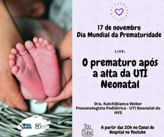 Nesta terça-feira, 17 de novembro, o Hospital Vida & Saúde promove uma live especial sobre o Dia Mundial da Prematuridade. A atividade terá início às 20h, e será transmitida pelo canal do Hospital no Youtube: https://www.youtube.com/watch?v=WwgYR33EPaU&feature=youtu.be