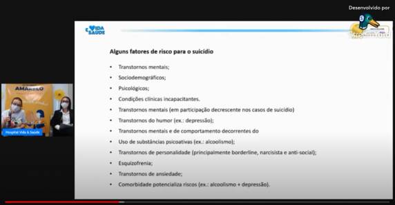 Com mais de 40 anos dedicados ao trabalho na Saúde Mental, a psiquiatra Lana Bárbaro apresentou importantes sinais que alertam para possíveis futuros quadros de suicídio, abordando aspectos da depressão e de questões da saúde mental em geral. Alertando sobre a importância de procurar ajuda médica, a Psiquiatra ressaltou a importância de estar atento às pessoas mais próximas, orientando sobre sintomas e formas de abordagem nestes casos. Palestra disponível em: https://www.youtube.com/watch?v=k9jlMtAvFC0&t=553s