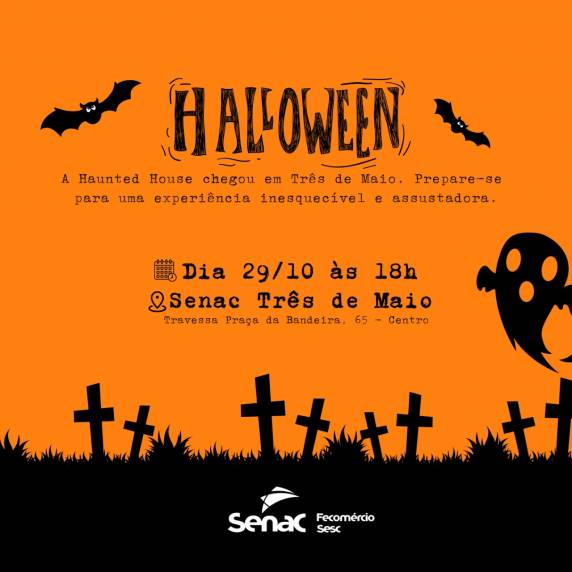 Para celebrar o Halloween, o Senac Três de Maio realizará uma experiência especial para promover a diversão e a integração da sua comunidade. A iniciativa ocorrerá nas dependências da escola no dia 29 de outubro, a partir das 18h. Na oportunidade, o público poderá visitar a Haunted House, na tradução livre, casa assombrada.