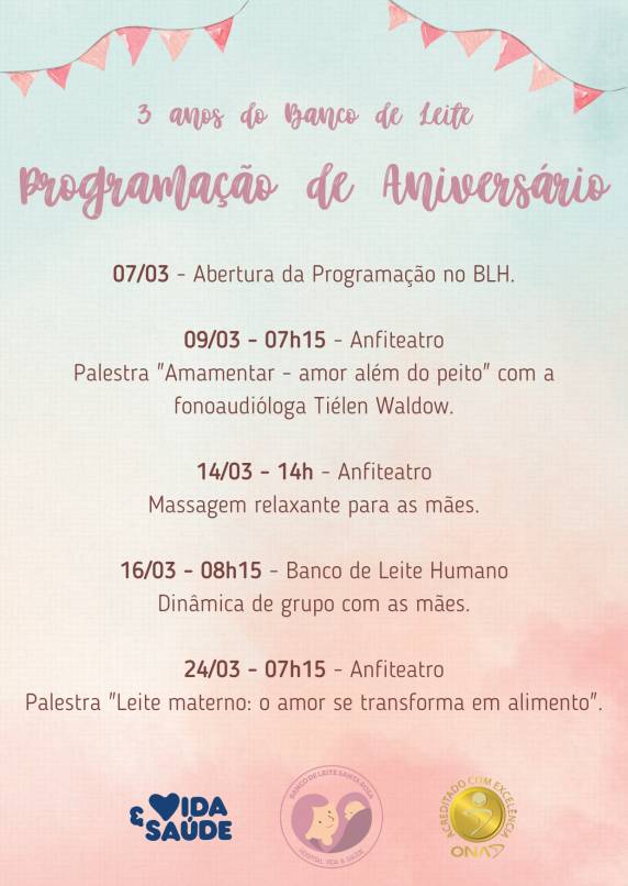 A programação inclui palestras, atividades recreativas, lanches especiais e momentos relaxantes. “As atividades foram pensadas como uma forma de levar carinho às mamães que estão com os bebês internados e que utilizam o Banco de Leite com frequência. Além disso, todas as mães que doam leite para o Banco poderão participar das atividades”, explica a nutricionista Marilia Fernandes, que realiza o acompanhamento nutricional das lactantes atendidas no BLH e dos bebês internados na UTI Neonatal.