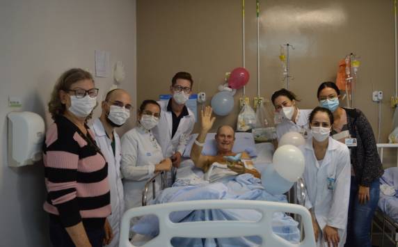 Internado há mais de 30 dias, seu Carlos Alberto Buttinger foi surpreendido na última quarta-feira (30), dia em que completou 48 anos. Com direito a bolo especial, balões e um cartão de felicitações, o paciente recebeu uma visita especial da equipe. Emocionado, ele agradeceu a homenagem e registrou a importância do momento para sua recuperação.