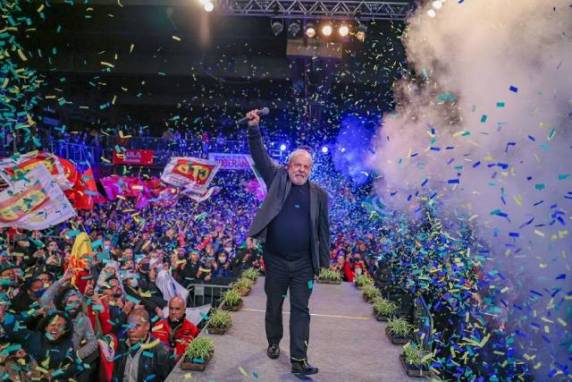 Lula surgiu no palco às 19h03min, ao lado da esposa, Janja, e Alckmin. Junto da ex-presidente Dilma Rousseff, os três foram até a passarela instalada à frente do palco para saudar os militantes.