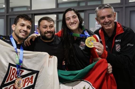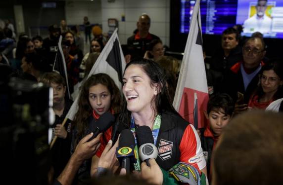 Mas, até mesmo pela presença da medalha de ouro no peito, Mayra foi o centro das atenções. Ainda no saguão do aeroporto, um dos abraços mais apertados foi na mãe, Leila Aguiar, que mais uma vez sofreu a distância, mas vibrou com a terceira conquista mundial da filha.