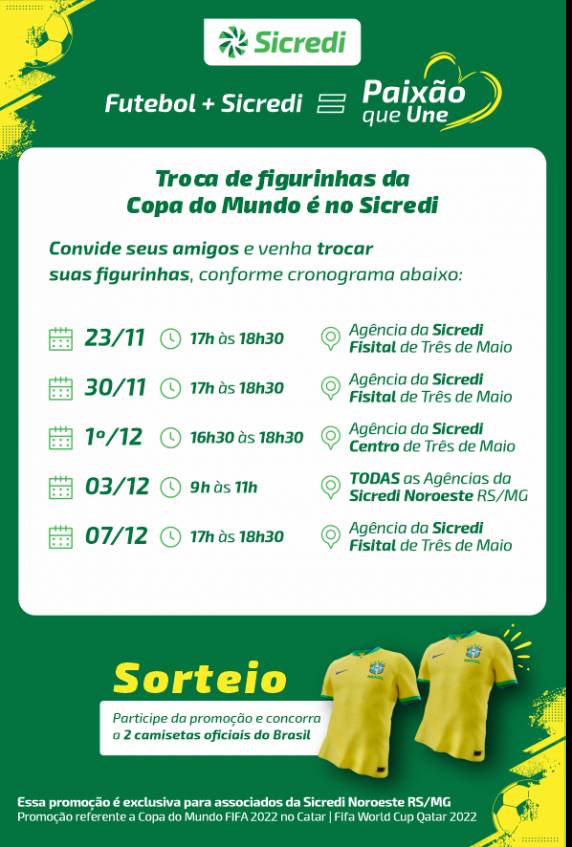 No último sábado (12/11), aconteceu um evento inédito de trocas de figurinhas nas agências da Sicredi Noroeste RS/MG. Os 12 municípios de área de atuação abriram as portas das agências no sábado para acolher famílias, crianças e adolescentes, colecionadores das figurinhas do álbum da Copa do Mundo FIFA no Catar 2022. E estará promovendo os encontros até dia 3/12. Confira as datas e vá na agência Sicredi mais próxima: