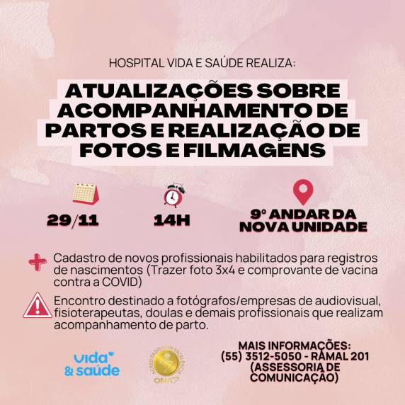 O Hospital Vida e Saúde realiza na próxima semana um encontro para atualização sobre acompanhamento de partos e realização de fotos e filmagens. A capacitação será na terça-feira (29), às 14h, no 9º Andar da Nova Unidade do Hospital.