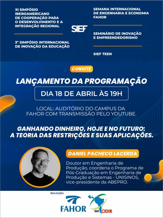 Para este lançamento, são esperados estudantes e também empresários, patrocinadores e apoiadores dos eventos, que poderão acompanhar também, a palestra “Ganhando dinheiro hoje e no futuro: a teoria das restrições e suas aplicações”, com a participação do professor Daniel Pacheco Lacerda, que é Doutor em Engenharia de Produção, coordenador do programa de Pós-graduação da Unisinos, vice-presidente da Associação Brasileira de Engenharia de Produção, pesquisador e com grande volume de publicações na área da Engenharia.