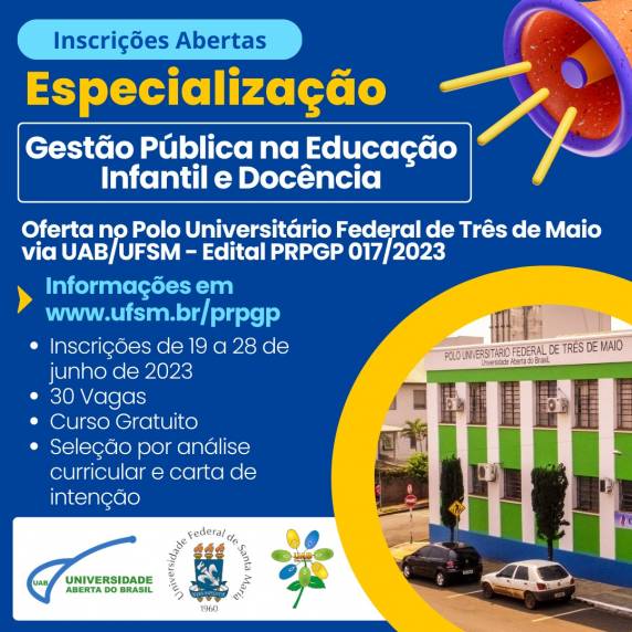 O Polo Universitário Federal de Três de Maio, vinculado a Universidade Aberta do Brasil (UAB), anuncia a abertura do Processo Seletivo para o Curso de Especialização em Gestão Pública na Educação Infantil e Docência, em conformidade com o Edital Geral PRPGP/UFSM n. 017/2023.