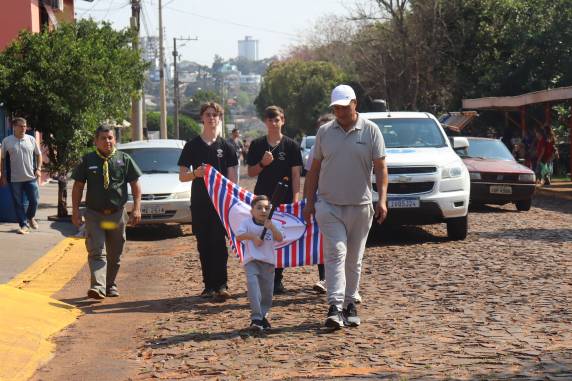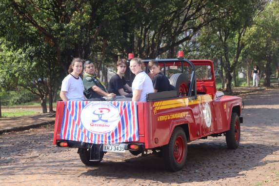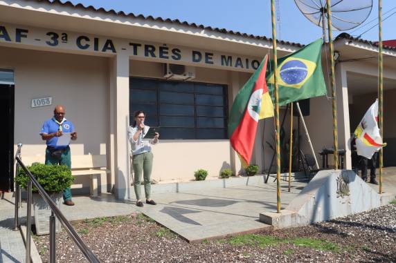 Foi conduzida na viatura do Corpo de Bombeiros Voluntários de Três de Maio pelos alunos da Escola Municipal de Ensino Fundamental Germano Dockhorn até o quartel da Brigada Militar do município, onde ficará até o dia 1º de setembro, quando será conduzida até a Praça Henrique Becker Filho, dando início a Semana da Pátria.