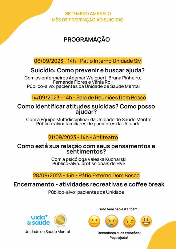 Responsável pelo tratamento de pacientes com transtornos mentais, a Unidade de Saúde Mental do HVS recebe adultos, crianças e adolescentes, e é referência no atendimento para municípios de toda região. A programação da Unidade contará com um momento voltado aos pacientes no dia 06. Já no dia 14, os profissionais realizarão um bate-papo com os familiares dos pacientes, alertando a importância de ficar atento as atitudes suicidas. No dia 21, a programação é voltada para os profissionais do HVS e o encerramento acontece no dia 28, com a realização de atividades recreativas na Unidade.
