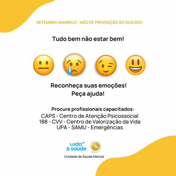 Ao longo do mês, a Unidade se integra ao Setembro Amarelo: mês de prevenção ao suicídio. Com o tema “Tudo bem não estar bem”, os profissionais alertam para a importância de solicitar ajuda profissional quando forem observados casos de dificuldade emocional.