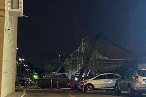 Na Avenida Assis Brasil, próximo à Rua Dona Alzira, o telhado de um bar voou e atingiu um carro no estacionamento de um condomínio
