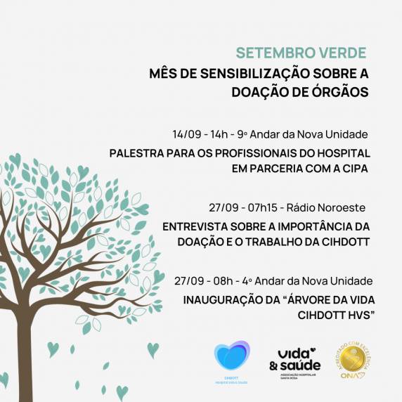Neste ano, o Setembro Verde do Hospital Vida & Saúde contará com uma atividade interna no dia 14, em parceria com a Comissão Interna de Prevenção de Acidentes (CIPA) quando os profissionais participarão de palestra sobre a importância da doação e poderão saber mais sobre o trabalho da CIHDOTT.