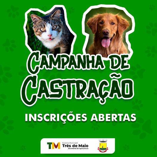 O Governo Municipal através da Secretaria de Agricultura em conjunto com a Secretaria de Saúde, comunica que as inscrições para cadastro de castração de cachorras e gatas já estão abertas e vão até o dia 15 de setembro.