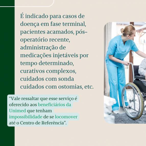 É indicado para casos de doença em fase terminal, pós-operatório recente, administração de medicações injetáveis por tempo determinado, curativos complexos, cuidados com sonda (vesical, nasoentérica, gastrostomia), cuidados com ostomias, etc. “Vale ressaltar que esse serviço é oferecido aos beneficiários da Unimed que tenham impossibilidade de se locomover até o Centro de Referência”.