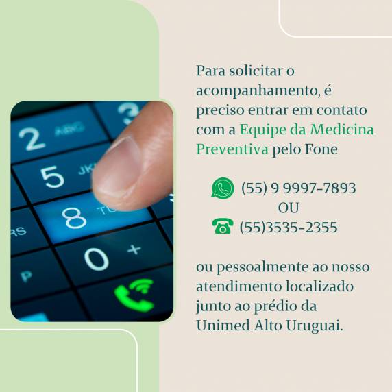 Para solicitar o acompanhamento, é preciso entrar em contato com a Equipe da Medicina Preventiva pelo Fone Whats. (55) 9 9997-7893 OU (55)3535-2355, ou pessoalmente ao nosso atendimento localizado junto ao prédio da Unimed Alto Uruguai.