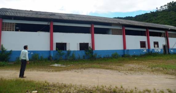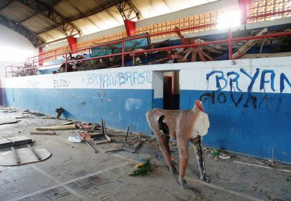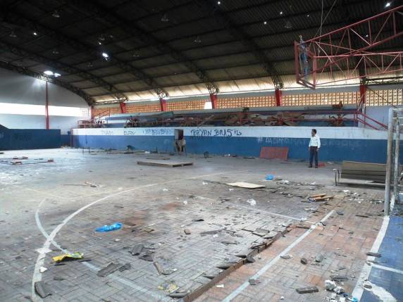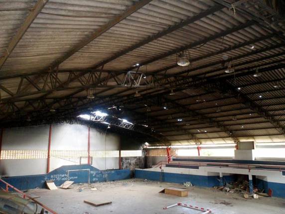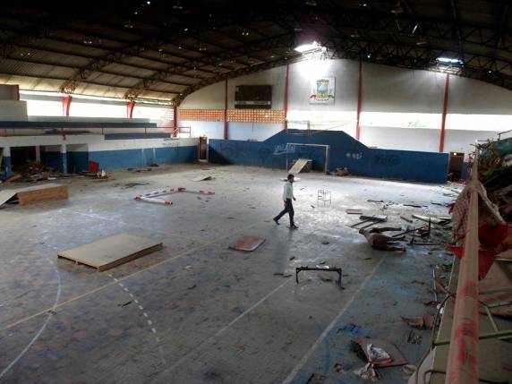 Externamente também se pode observar a precariedade da construção bem como o campo de futebol localizado nos fundos do Ginásio mais parece um haras, pois vem