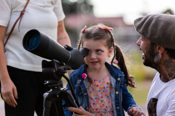 Na área externa, o projeto Dispersar apresentava aos visitantes as diferentes aves da região da fronteira noroeste do Rio Grande do Sul. As crianças corriam pelo gramado, brincavam e se revesavam para fazer a observação na luneta disposta em frente ao letreiro do Memorial e nos binóculos trazidos pelo grupo de pesquisadores. Ao lado, uma projeção mostrava diversas espécies registradas em vídeo pelos membros do projeto.