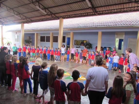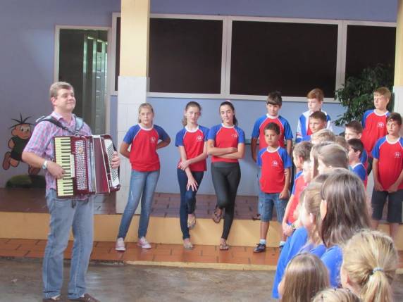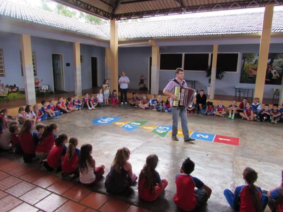 primeiro dia do ano letivo contou com a presena de Frei Laerte que entreteve os estudantes com msicas diversas acompanhado de sua gaita, momento seguido por uma orao abenoando