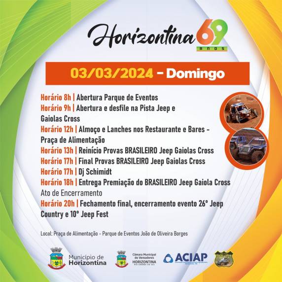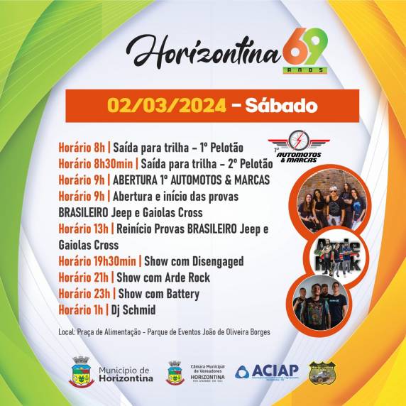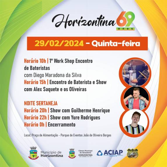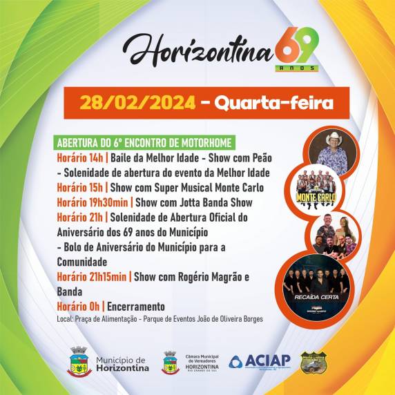 COMEÇA NESTA QUARTA-FEIRA - FERIADO MUNICIPAL, PROGRAMAÇÃO DOS 69 ANOS DE HORIZONTINA - CONFIRA A AGENDA DE ATRAÇÕES!