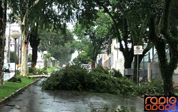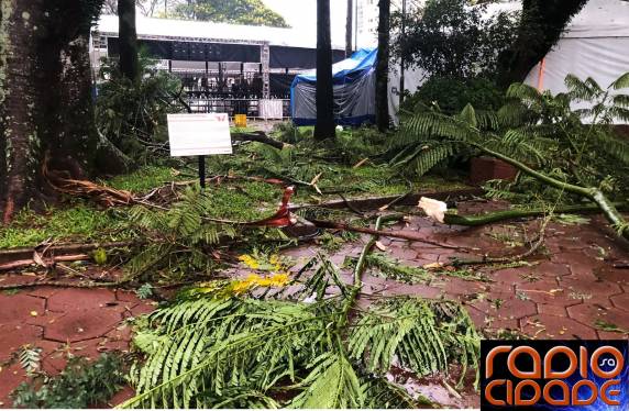 Nas ruas Antunes Ribas e 15 de Novembro, árvores caíram sobre a fiação elétrica e telefônica, resultando na falta de energia elétrica em partes da zona norte da cidade. Equipes da Defesa Civil estão em ação para avaliar os estragos causados pelo temporal.