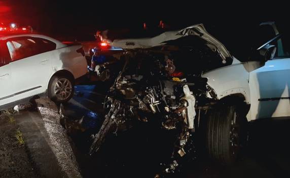 Motociclista colidiu de frente com um caminhão; carro também se envolveu no acidente